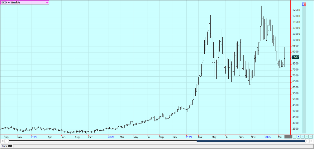 Cocoa: New York and London closed higher last week despite the Trump tariff moves. Trends are still generally up in these markets, but demand ideas got hurt as the tariffs will increase costs to US buyers of chocolates. Cocoa imports are now subject to a 10% tariff at minimum. Ideas are that a strong crop is expected and the ICCO recently raised its forecast of production for the coming year. Ivory Coast port arrivals and Ghana arrivals are expected to fade but have held strong so far. There is talk that production will be short of demand for the fourth year in a row, and Ivory coast has already said that offers into the world market will be less this year. Chart trends are mixed to down in both markets on the daily charts. Producers in Ghana and in Ivory Coast have been fighting against too little rain that has reduced yields.