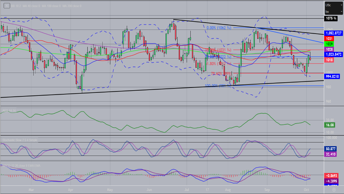 Corn continued the pullback this week, despite a Wednesday/Thursday rally that tried to take losses back. December was still 3 cents lower from last Friday. Grain Stocks data tallied September 1 corn stock at 1.532 bbu, down 231 mbu from last year, but a 207 mbu above the September WASDE ending stocks estimates. Monday’s Crop Progress report indicated a total of 95% of the US corn crop dented as of September 21, with 71% mature. Harvest was 18% complete by last Sunday. Conditions were steady on the week at 66% good/excellent, with the Brugler500 index unchanged at 370. Weekly EIA data from Wednesday showed ethanol production falling another 29,000 barrels per day in the week ending on September 26 at 995,000 barrels per day. Stocks of ethanol saw a draw of 704,000 barrels to 22.764 million barrels.