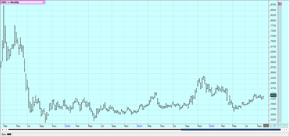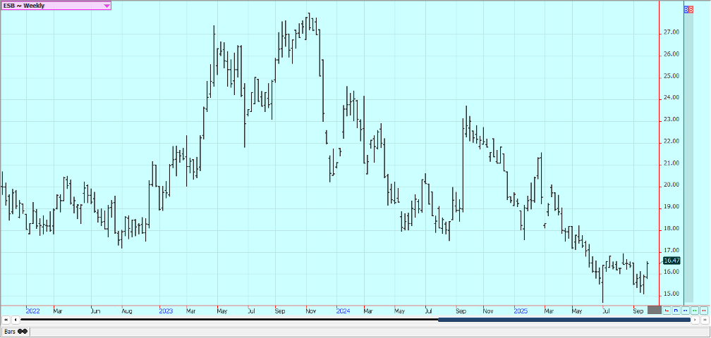Sugar: New York was higher last week but London closed a little lower. Trends are still sideways in New York and in London, but trends in New York are turning up. Ideas of good supplies for the market from good growing conditions for cane and beets around the world continue. The South Center Brazil harvest is faster now amid drier conditions. Production in Center-South Brazil has also been strong. Sugar production in the center-south region rose 15.72% in the first half of September compared to last year. The outlook for cane crops in India and Thailand are in good condition with reports of good rains this year, while Brazilian cane continue to favor producing sugar over ethanol.
