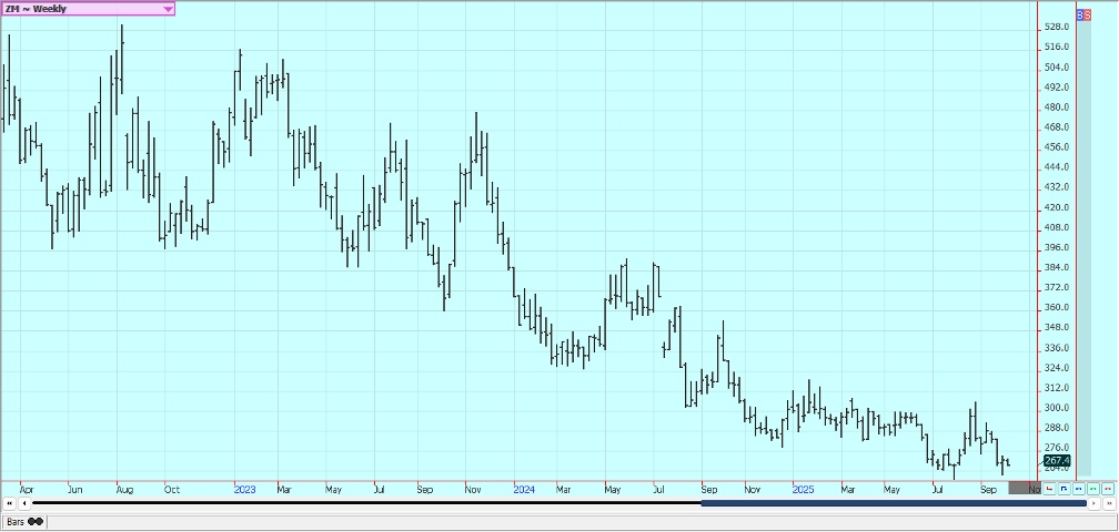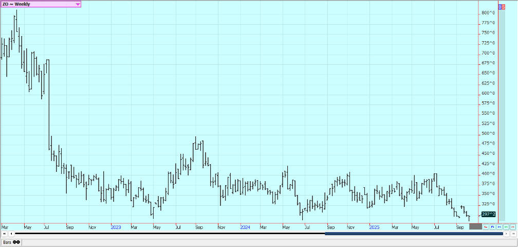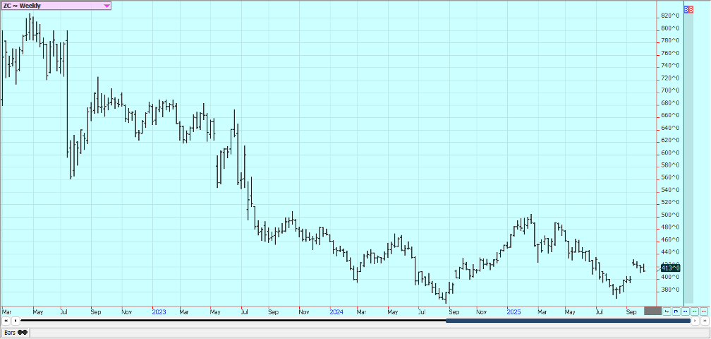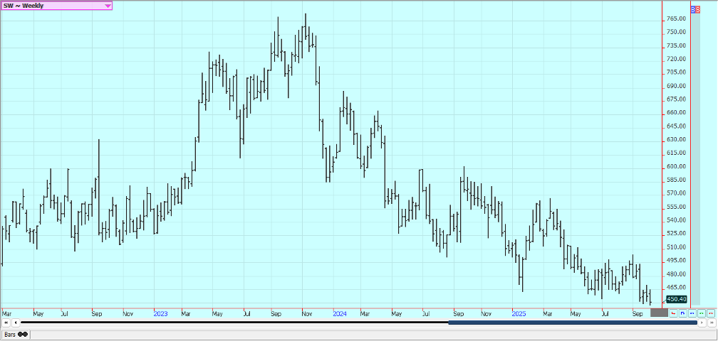 Wheat: Wheat closed lower in quiet trading last week. Russian crop areas remain too dry in Winter Wheat areas and too wet in Spring Wheat areas, but crop size ideas are expected to increase due to reports of big yields in Spring Wheat growing areas. Sovecon has raised its production estimates by 600,000 tons to 87.8 million tons due to higher production in Siberia. Ideas are that production there next year will feature reduced planted area due to the lack of profitability. A French government report showed plenty of production but lower quality. Rains have been good in the northern Great Plains and Canada. It has been warm in the Great Plains so far this Fall. Southern hemisphere crops appear to be good.