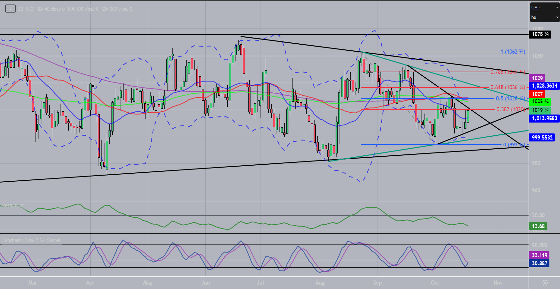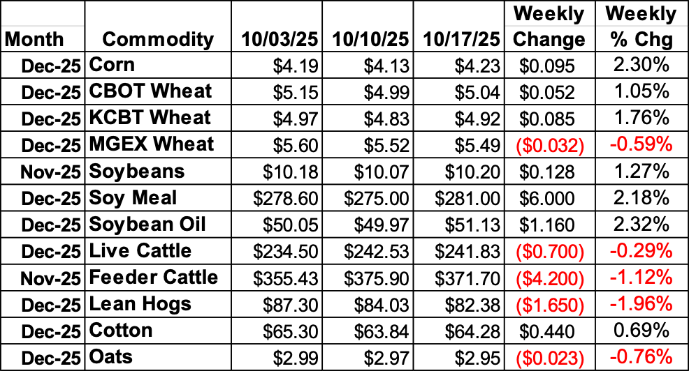 Corn futures finally saw a weekly gain this week, with December back up 9 ½ cents to take back 3 weeks of losses. USDA offices were closed for the most part, as the government shutdown continued. We are still getting bits and pieces of ‘essential’ data. The Export Inspections report showed 1.12 MMT of corn exported in the week of 10/9, down 33.6% from last week but well above the same week last year. Year to date exports are 64.97% larger from last year at 7.94 MMT. USDA is close, but CONAB was not with the Brazilian entity taking their total Brazilian corn crop number to 138.6 MMT for 2025/26. Weekly EIA data is still being released, with ethanol production reported up another 3,000 barrels per day in the week ending on October 10 at 1.074 million barrels per day. Stocks of ethanol saw another draw of 92,000 barrels at 22.63 million barrels.