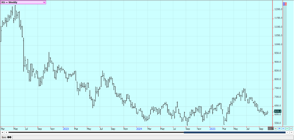 Rice: Rice was a little lower in choppy and two sided trading last week. Trends are still turning down in the market. The harvest is wrapping up in Texas and southern Louisiana. Harvest is now wrapping up in Mississippi and Arkansas. Yields and quality are mixed, but quality appears better than a year ago. The cash market has been slow with low bids from buyers in domestic markets and average or less export demand. Louisiana reports good but not great yields and quality.