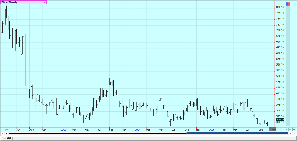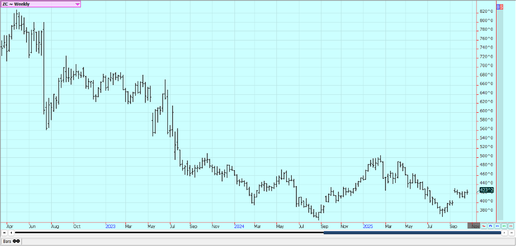 Corn:  Corn was higher last week on news that the US government will start to support farmers even with the government closed.  The Wall St Journal said that the total support could total 3.0 billion dollars.  Also, the president has sanctioned Russian Crude Oil exports in a move that rallied Crude Oil and supported ethanol and Corn prices.  Trends are sideways in the market.  Most USDA reports are cancelled as the government is still closed.  The harvest is active in all areas of the Midwest.  There are ideas that US production might not be super strong due to disease such as rust to offset the demand losses.  Yield reports are showing at or above APH yields in western areas, with very good crops reported in Minnesota.  Yields have been reported at or less than APH in areas east of the Mississippi River.  Temperatures should average near to above normal this week and there are forecasts for mostly dry conditions.  Most of the western Midwest has seen adequate or greater precipitation and production ideas are high.  Areas east of the Mississippi River have been very dry for the last month or more.  Demand for Corn in world markets remains moderate to strong.  Oats were a little higher.