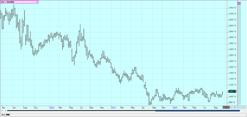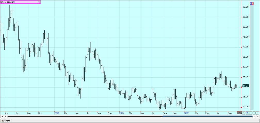 Soybeans and Soybean Meal:  Soybeans and Soybean Meal were higher last week and Soybean Oil was lower as the trade war between the US and China continued but as President Trump said that a primary focus of his proposed meeting with Xi of China remains Chinese Soybeans demand.  The US government has announced that it will support farmers with about 3.0 billion dollars even with the government closed.  Traders are looking forward to positive results from the meeting between Trump and Xi near the end of the month.  China has shown no interest in buying US ag products and Trump has also threatened to regulate cooking oil imports from China in a new escalation in the war as China is restricting Rare Earth metals to the US.  Forecasts call for showers and rains to be seen in the Midwest this week.  Temperatures will average near normal.  Prices are still higher in Brazil, but China and other buyers are still buying there for political reasons.  Export demand remains less for US Soybeans as China has been taking almost all the export from South America due to the Trump tariff regime.