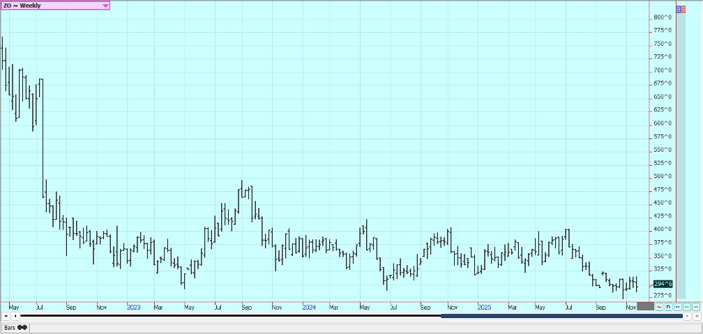 Corn: Corn was higher last week.  Ideas are that demand is less now due to increased competition in the world market.  Trends are mixed in the market.  The harvest is almost over in all areas of the Midwest.  There are ideas that US production might not be super strong due to disease such as rust to offset the demand losses.  Temperatures should average below normal this week and there are forecasts for some rain early this week.  Oats were lower, but trends are turning up anyway.