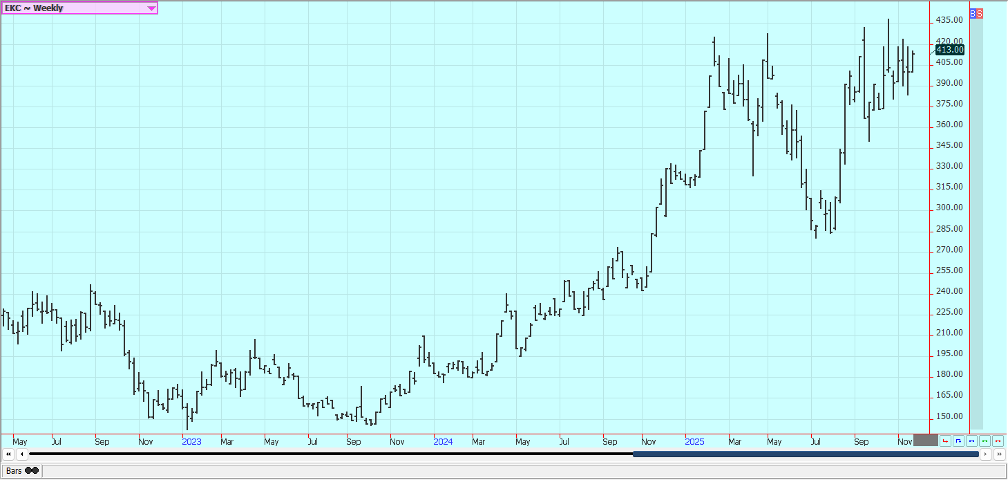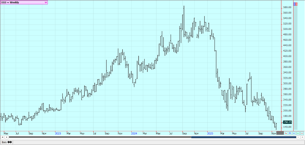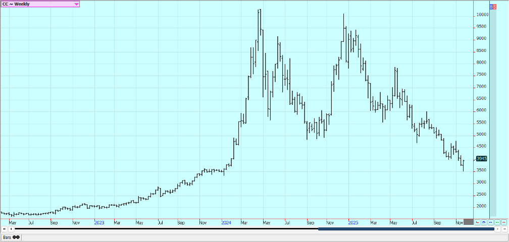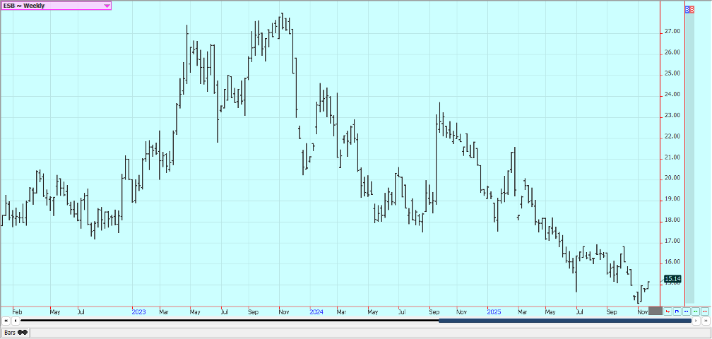 Sugar:  New York and London were a little higher last week.  Trends are sideways but are trying to turn up.  There are still ideas of good supplies for the market from good growing conditions for cane and beets around the world continue.  Production in Center-South Brazil has also been strong, but the south center harvest is almost over.  The prospect of a big global surplus in the 2025/26 season was keeping the market on the defensive with a rise in production in India and Thailand set to increased supplies while global consumption is expected to remain steady.