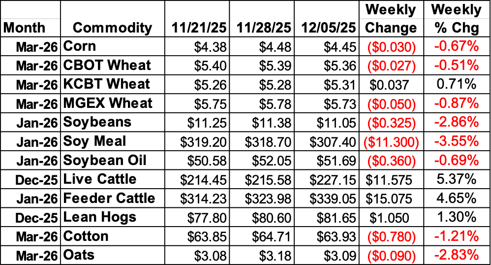 Corn slipped up in the latter half of the week, with March down 3 cents. Weekly Export Inspections showed 1.421 MMT of corn shipped in the week of 11/27, down from the previous week but still seasonally high. EIA data showed ethanol production rising 13,000 barrels per day in the week ending on November 21 to a record 1.126 million barrels per day. Stocks of ethanol stocks saw a draw of 543,000 barrels at 22.511 million barrels. Export Sales data was released twice this week as USDA catches up, with 1.8 MMT sold in the week of 10/23 and 1.99 MMT for the week of October 30. Commitment of Traders data is still aged, with managed money in corn futures and options trimming their net short position by 71,479 contracts in the week of 10/28 to 89,506 contracts.