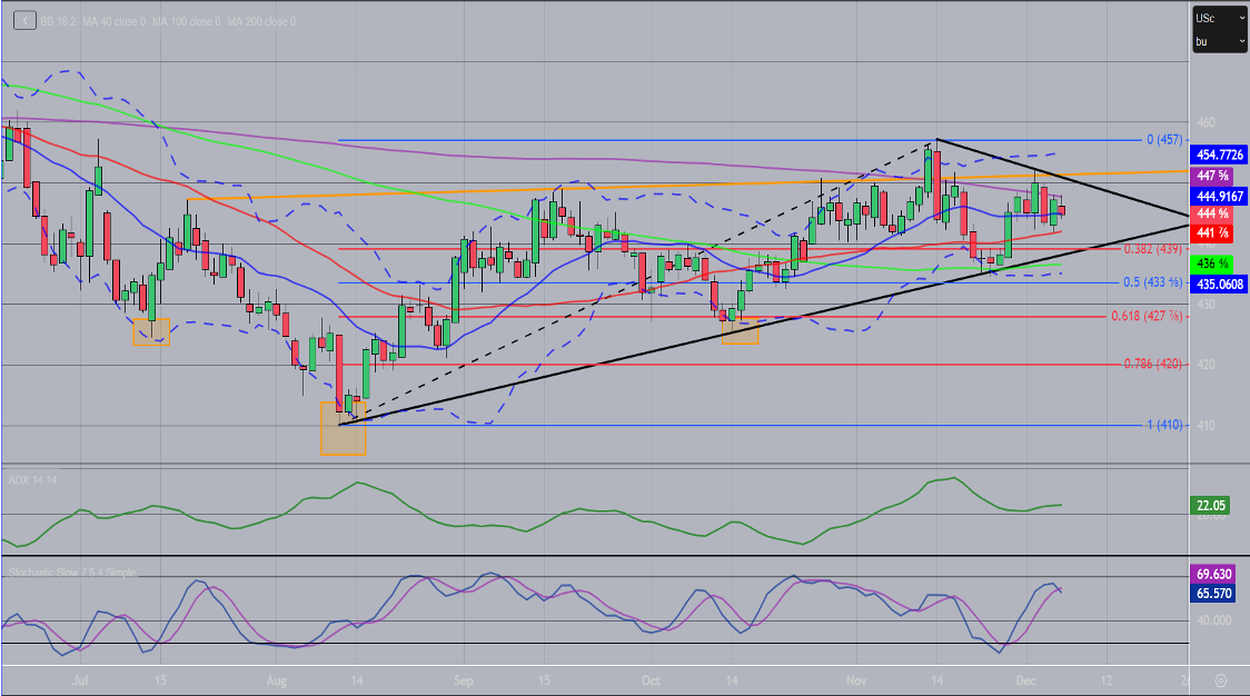 March corn started consolidating this week with an 11 cent range. Stochastics have transitioned to high to neutral, crossing and technically inert. There is an uptrend line off the August low at $4.38 ½, which brough buyers at the end of November, along with the 100-day moving average at $4.36 ½. That general area is the one to watch in a pullback. Breaking that may indicate a move back towards the August low.  On the contrary, there is a downtrend line off the November high at $4.50 ¾ as resistance, along with a 200-day moving average at $4.47 ½. The market seems contend in the $4.35-4.50 area, as demand has remained, with export business continuing and record ethanol grind, despite a record supply of corn around the country. That doesn’t mean something can’t come in and change that.