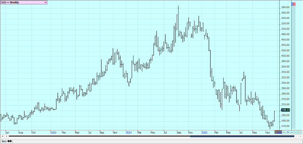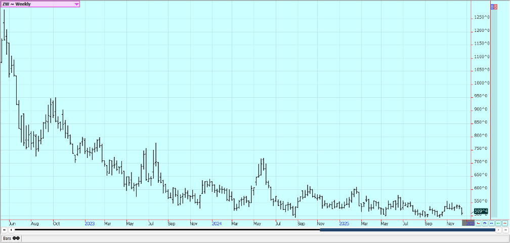 Frozen Concentrated Orange Juice and Citrus: Futures were higher last week and closed at the highs of the week. Prices have rallied in the last few days after cold weather hit the state of Florida and reminded everyone what time of the year it was. Traders are worried about demand even with overall lower prices. The weather is considered good for production here and in Brazil and Mexico. Development conditions are good in Florida and in Brazil now with occasional showers in Florida and dry weather in Brazil.
