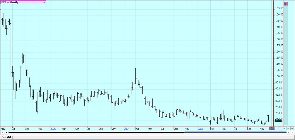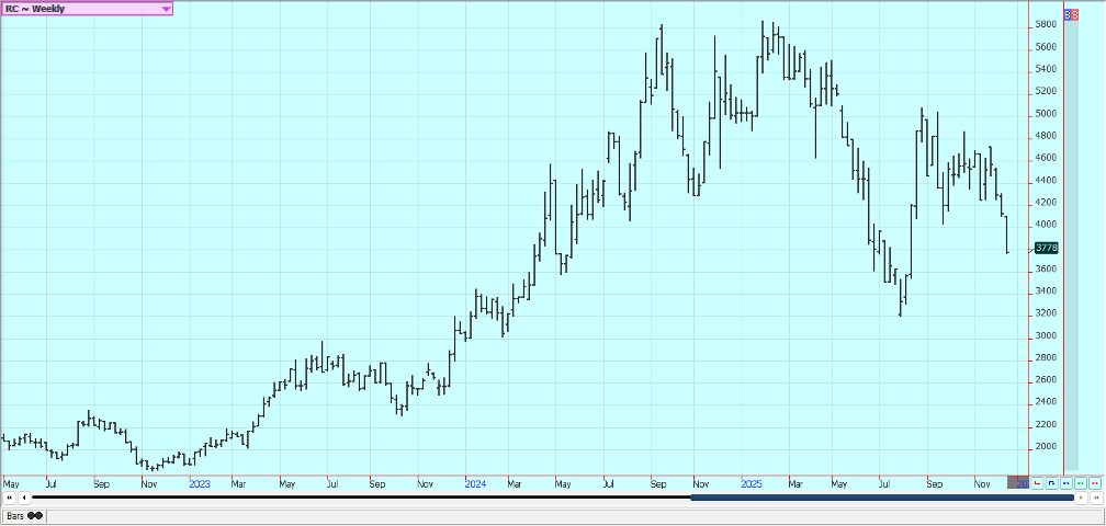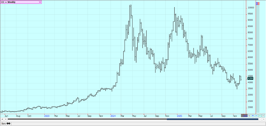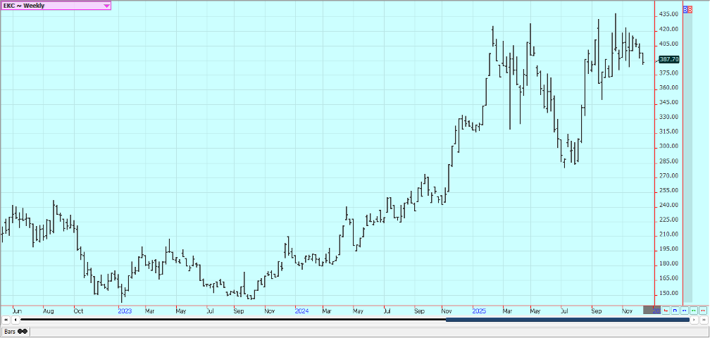 Cocoa: New York and London closed lower last week in quiet trading. Short term trends turned down early in the week. A big main crop harvest is anticipated in West Africa and rains have been positive for crops lately. Light rains mixed with heat in Ivory Coast’s cocoa-growing regions last week signaled a positive outlook for the main crop. There are still reports of increased production potential in other countries outside of West Africa, including Asia and Central America. The market feels that there is less demand and the lack of demand is expected to continue.