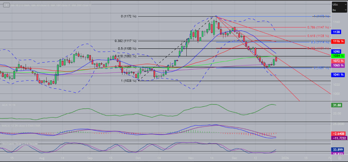 March soybeans got a nice little bounce this week. Still, with the thinner holiday trade and limited follow through, this may be just a dead cat bounce. After finding support at a 78.6% Fibonacci retracement of $10.59 ¼, futures saw a bounce to the 1/3 speed line on Friday, finding resistance at $10.82. In terms of getting any push higher to the upside, that would be the area to keep an eye on. There is a 38.2% Fibonacci retracement from the November high at $11.01 ¼, which may be a point to look for if we get some extended month/year end short covering. The ADX at 31 says to follow the bearish MACD, though stochastics do have a buy signal and are turning bullish.