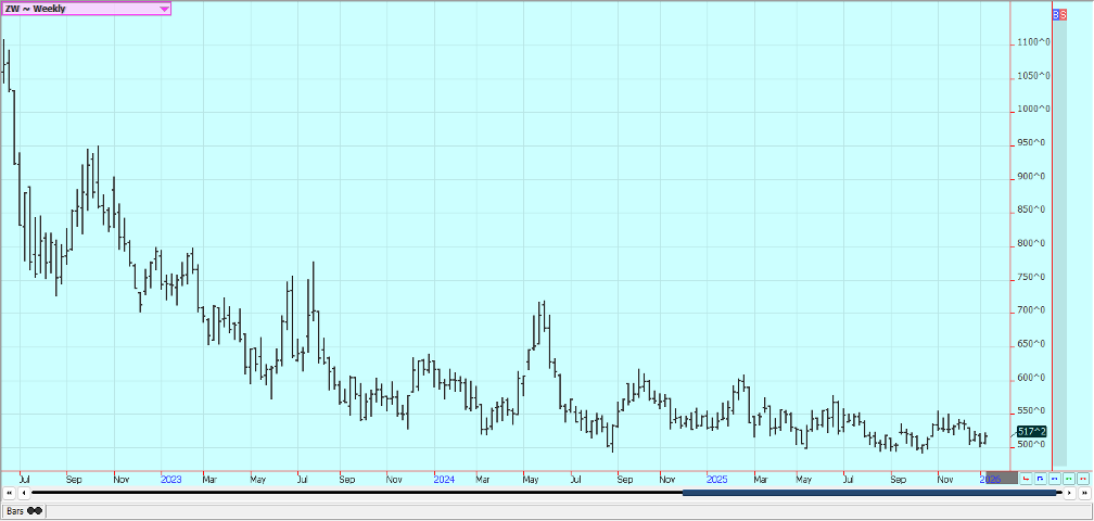 Frozen Concentrated Orange Juice and Citrus: Futures were higher last week as the rally continued. Chart trends are still up. There is no freeze in the forecast, but areas north of the state have been very cold. Florida has also been dry and irrigation is needed. Traders are worried about demand even with overall lower prices. The weather is considered good for production in Brazil and Mexico. Scattered showers are reported in Brazil.