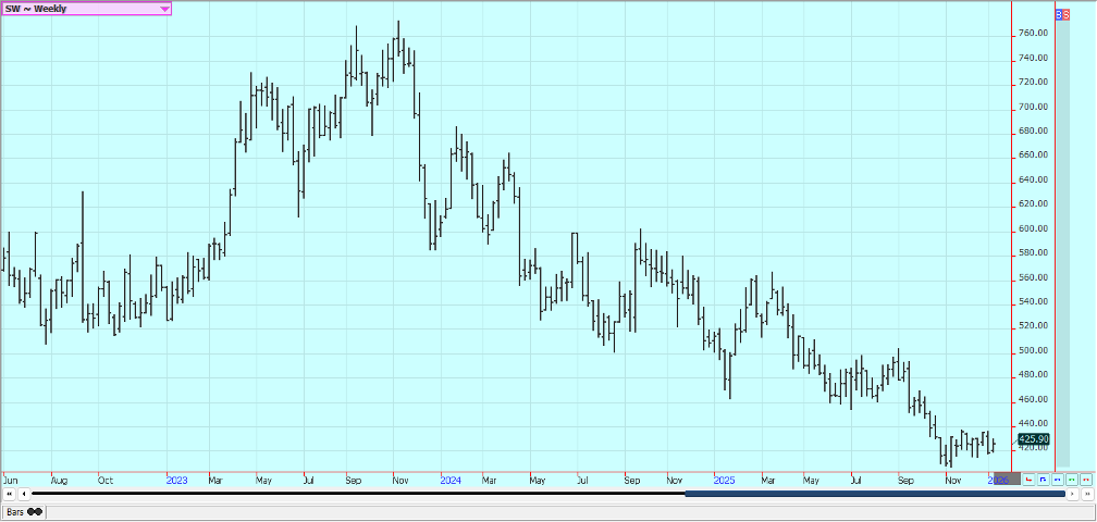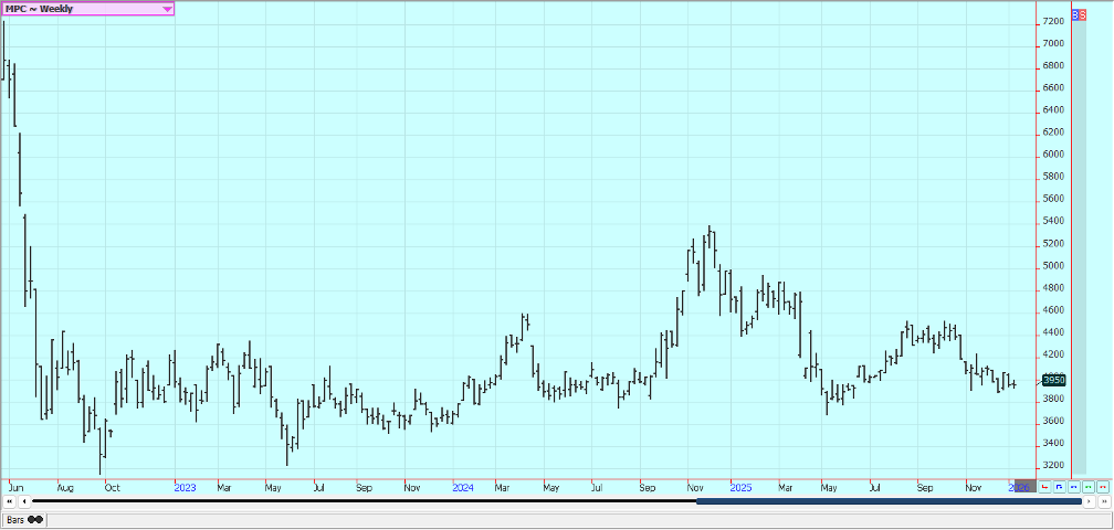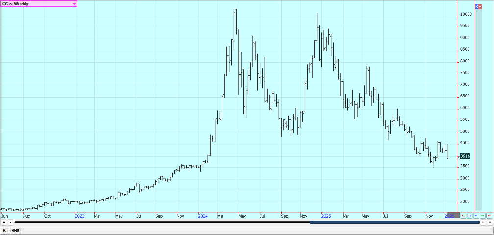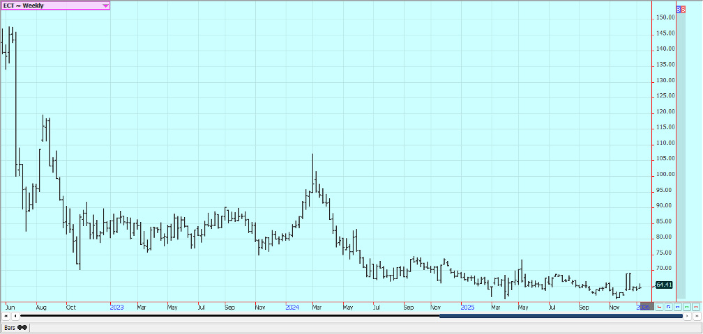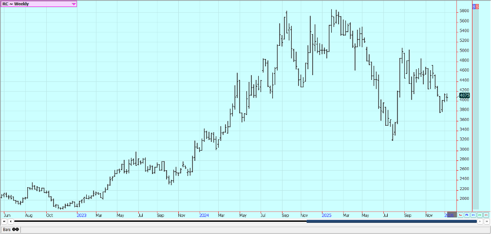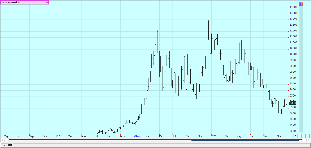 Sugar: New York was lower and London was higher last week. New York turned down after trading violently between 1500 and 1600 March and London has maintained trading range in the weekly charts. There are still ideas of good supplies for the market from good growing conditions for cane and beets around the world continue. The prospect of a big global surplus in the 2025/26 season was keeping the market on the defensive with a rise in production in India and Thailand set to increase supplies while global consumption is expected to remain steady. The FAO said that Sugar prices rebounded last month, rising 2.4% after three straight months of declines, due to a sharp drop in production across Brazil’s key growing regions. However, expectations of ample global sugar supplies this season, bolstered by solid harvest progress and favorable production prospects in India, helped cap gains in world prices. Sugar prices for the year fell 17%, with the index recording its lowest annual value since 2020, amid strong export availability.