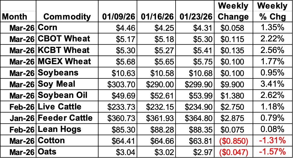 The wheat complex saw some strength this week, with the winter wheat’s putting in some premium late. March CBT was up 11 1/2 cents, with March KC 13 ½ cents higher on the week. March MPLS spring wheat was 10 cents in the green. Weekly Export Sales data from the week of January 15 was a 9-week high at 618,076 MT. That takes export commitments to 21.034 MMT, which is 86% of USDA’s forecast, and behind the 87% average sales pace. CFTC data from the week of January 20 had specs in CBT wheat futures and options adding 4,471 contracts to their net short at 110,700 contracts. In KC wheat, they added to their net short by 237 contracts to 13,018 contracts in that week.