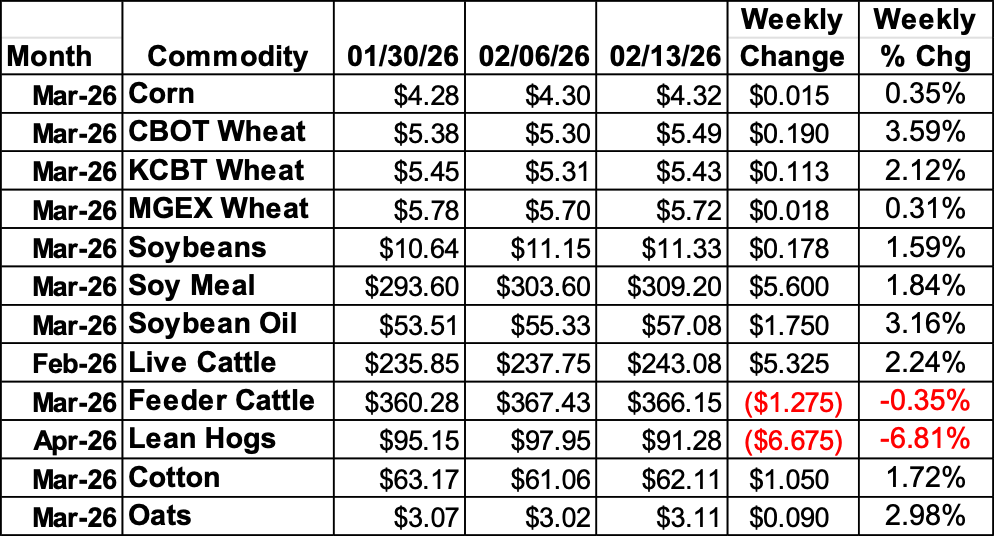 Soybeans extended the rally this week, with March 17 3/4 cents higher. Products added some continued support, as March soybean meal was up $5.60/ton, with bean oil 175 points higher. USDA left their US balance sheet alone this week on the US side at 350 mbu, Brazil production was raised by 2 MMT to 180 MMT. The market took that in stride, as the buying seemed to continue on ideas of increased China purchases. Brazil’s CONAB raised their number by 1.86 MMT to 177.98 MMT. Weekly Export Sales data showed a MY low 281,798 MT of soybeans sold in the week ending on February 5, down from last week’s low. Commitments are now 34.572 MMT, which is 80% of USDA’s forecast, and behind the 88% average pace. CFTC data via the Commitment of Traders report showed spec traders adding another 94,316 contracts to their net long to 123,147 contracts by 2/10.