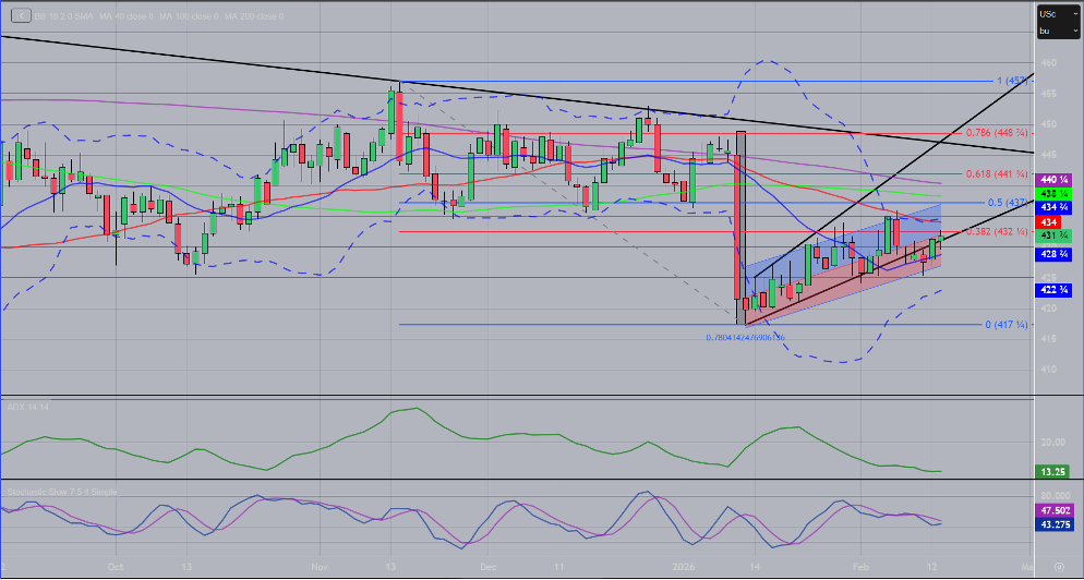 After March corn appeared to show a bear flag formation following USDA’s January crop report, there has been a lack of follow through to the downside. Despite several attempts to breakthrough an uptrend line, the market has held up. There is a rising regression channel with support near $4.27, as the 18-day moving average at $4.28 ½ has held. Stochastics are sitting in neutral as we chop our way in the uptrend. There is a 38.2% Fib retracement resistance at $4.32 ¼, with the 50% at $4.37. The 40-day moving average is also resistance at $4.34. The choppy trade continues, but the keys to a break higher would be $4.36, with a test below $4.25 suggesting more downside risk.
