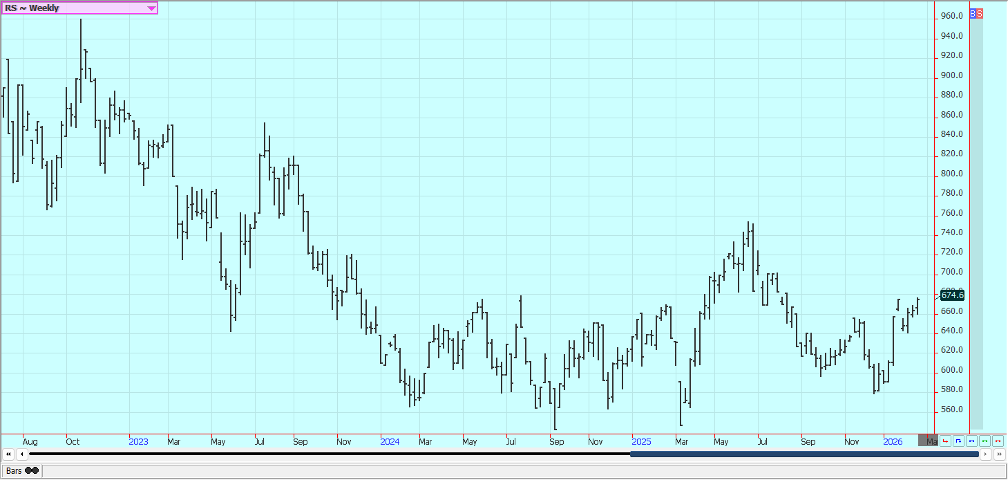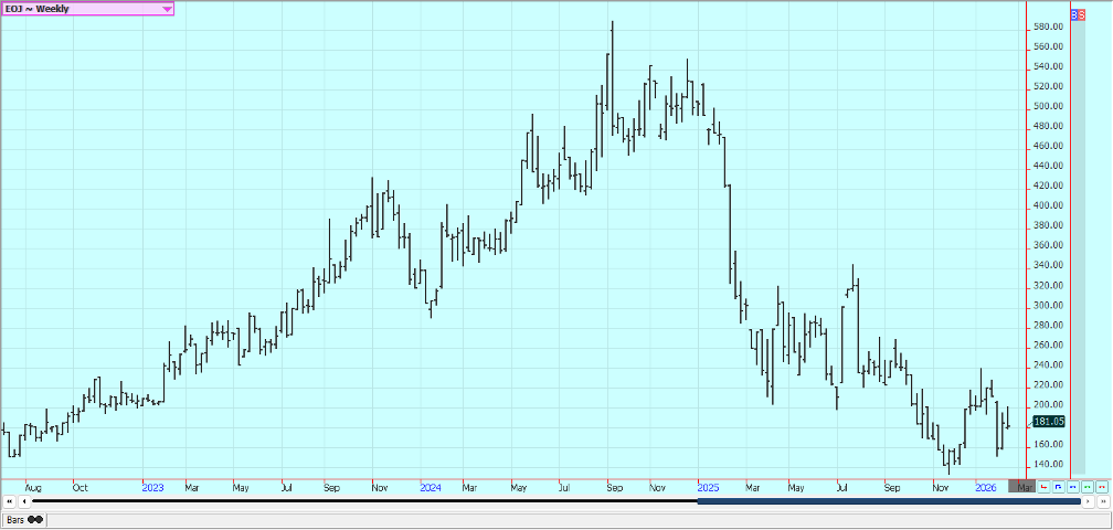Coffee:  Both markets closed lower last week as good weather for growing and harvesting continues to be seen in Brazil and Vietnam.  Production ideas are high in both countries.  The trends are mixed in New York and mixed in London on the daily charts.  There are still reports of harvest sales from Vietnam as the new harvest is active.  There are reports of very good conditions in Brazil and a large crop is forecast.  Brazil producers have stopped selling due to the recent fall in prices.  Scattered showers are being reported now to improve tree condition in Brazil.  Mexico is in good condition, as is Central America.  Vietnam has scattered showers lately and conditions there are called good.  Vietnamese producers are selling new crop Coffee.