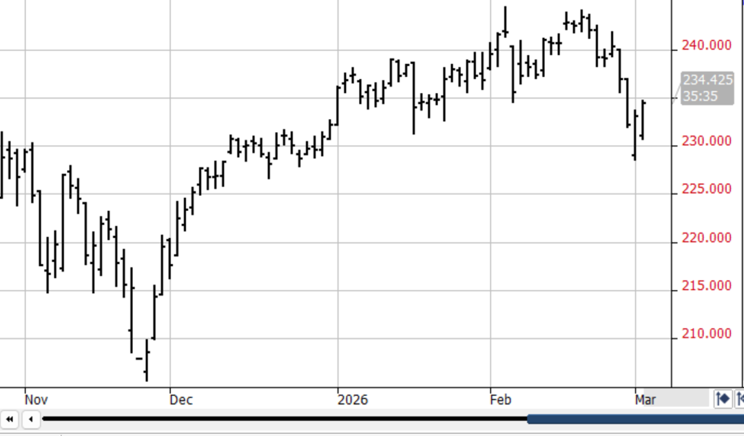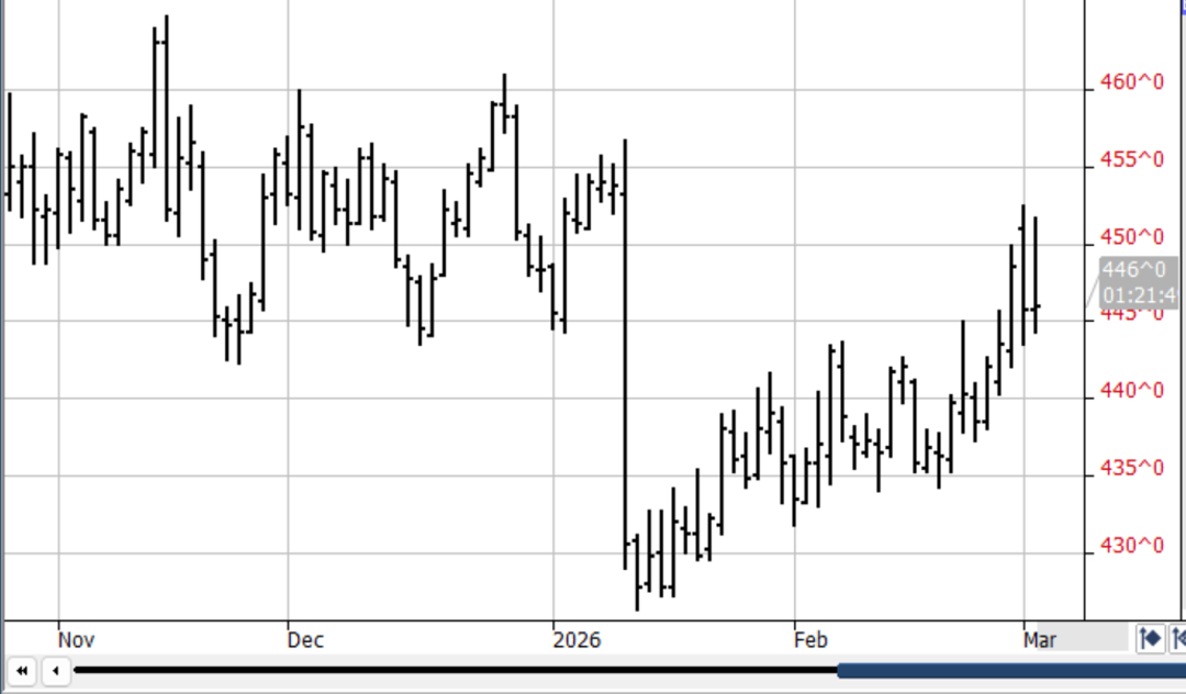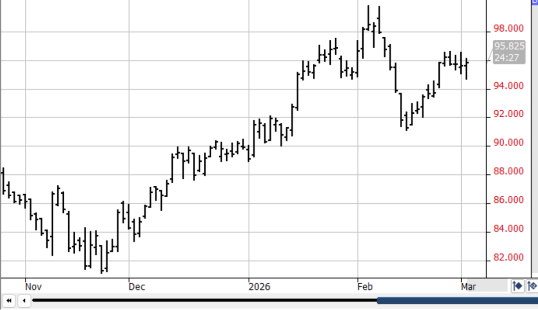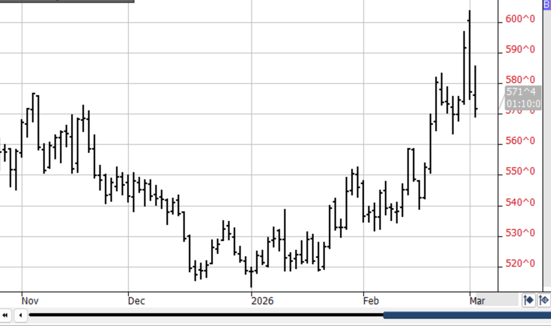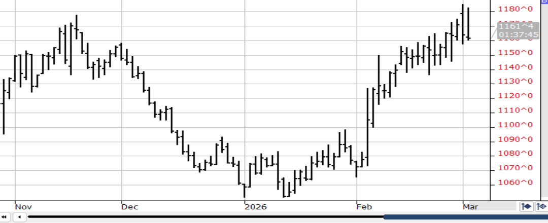 The IRANIAN WAR started last Saturday has introduced many variables & volatility into grain mkts – today alone US $ is sharply higher in a flight to safety, the DJI is sharply lower off inflation, recession fears & crude oil is up $10 since the W/E off the closing of the Straights of Homuz! However good news surfaced overnite as the US-China Summit scheduled for 4-1-26 is still on despite China’s disapproval of the war! This & the soaring crude oil prices temporarily lifted bean prices to the highs of their $1.20 rally which commenced on 1-1-26! Recent estimators have ratcheted down the Brazilian bean crop to 177-8mmt from 182-3! The record crop appears dialed in – and better China exports should extend the current rally!
