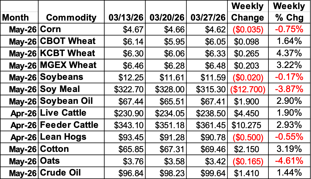 Soybeans were higher for much of the week but faded back late to close with May down 2 cents from last Friday. The nearby new crop spread narrowed by a nickel, with November up 3 cents. May soybean meal was the pressure factor, down $12.70/ton, as bean oil was up 190 points. EPA released their finalized RVOs for 2026 on Friday, with bio-mass based diesel set at 8.86 billion RINS (not gallons), which exceeded the 7.12 billion RINs previously proposed. The small refinery exemption reallocation takes that to 9.07 billion RINS for 2026. They also announced that in 2028, foreign fuel and feedstocks will only receive 50% of the RIN value. Export Sales data showed soybean bookings at a marketing year low of 668,901 MT of soybeans sold in the week ending on 3/19. Commitments are now 37.26 MMT, which is 87% of USDA’s forecast, and behind the 95% average pace. The weekly Commitment of Traders report showed spec traders cutting back another 4,093 contracts from their net long of 197,904 contracts by 3/24.