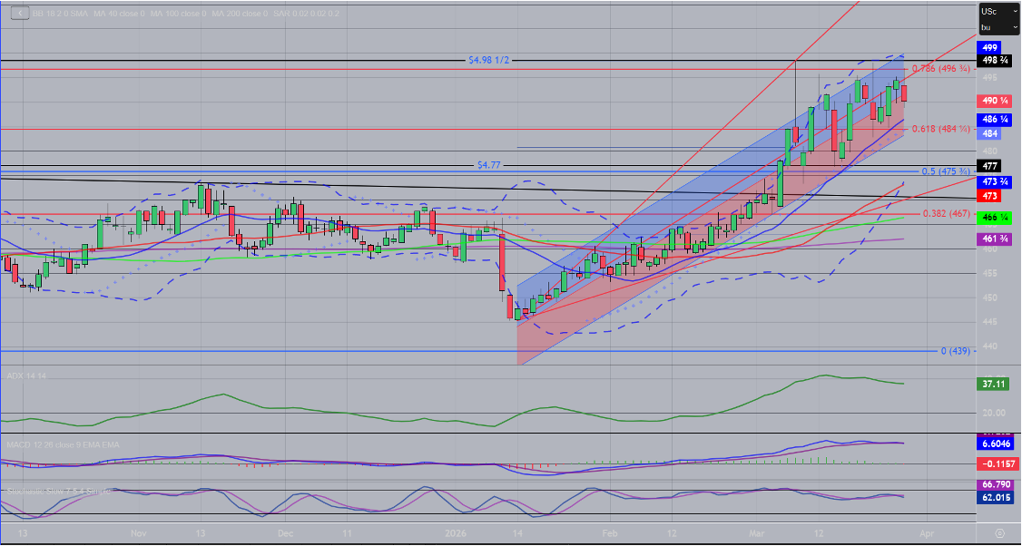 December corn has remained in the uptrend, though recent action has gotten choppy. There is a 78.6% Fib retracement resistance off the LOC high to low at $4.96 ¾, which has largely held. The spike to $4.98 ½ has become a double top, which would be a triple top on another test, which (almost) never hold. MACD is looking to flip bearish after losing momentum. Friday was an outside day lower, not bullish by any means but technically inert. Supper comes via the 18-day moving average at $4.86 ¼, with the parabolic SAR at $4.84. There is a rising regression channel with support at $4.83 after widening out. The 38.2% Fib retracement support (not pictured) off the recent high is at $4.78 and held last week. Any break below the $4.83-4.85 level, would likely suggest a broader break to the downside.