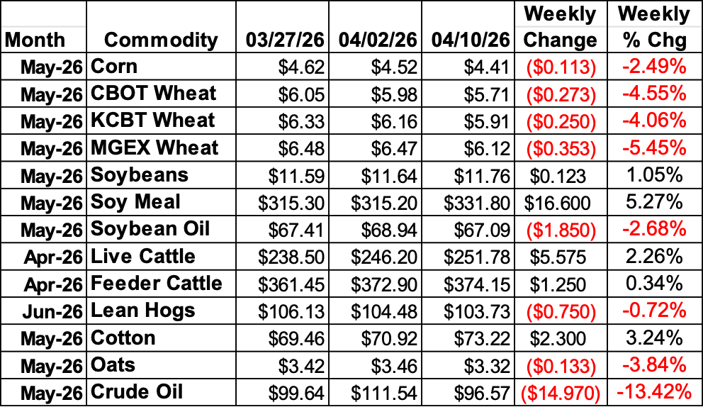 Corn felt some continued pressure this week, as May ended up 11 ¼ cents lower from last week. The initial Crop Progress report from NASS on Monday showed 3% of the US corn crop planted, near the 2% average pace. USDA’s WASDE report from this week showed no changes to the US balance sheet, as US ending stocks were left at 2.13 bbu. EIA showed ethanol production back up 41,000 barrels per day in the week of 4/3, to 1.116 million bpd. Stocks saw a slight build in that week of 62,000 barrels to 26.053 million barrels. USDA Export Sales data showed old crop corn business at 1.36 MMT in the week of April 2. Commitment of Traders data as of 4/7 tallied managed money at a net long of 218,632 contracts of futures and options. That was a 49,342 contract reduction on the week.
