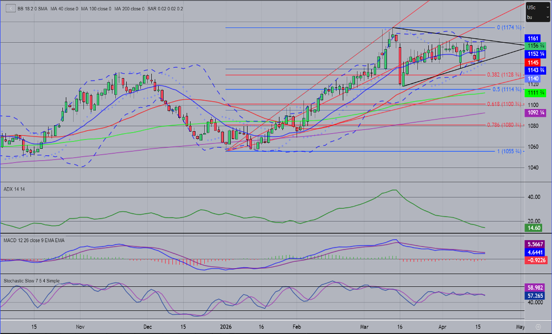 Soybeans were lower this week with May down 8 ½ cents from last Friday. May soybean meal was unchanged since last Friday. May bean oil was up 107 points. Crop Progress from Monday afternoon pegged the US soybean crop at 6% planted, well above the 2% compared to the same date last year and the 5-year average. NOPA data showed March crush among members at 226.16 mbu, a record for the month. That was up 8.32% from February and 16.25% above March 2025. Soybean oil stocks were down 1.97% from the end of Feb at 2.04 billion lbs, which was still 36.11% above the same month last year. Export Sales data showed soybean bookings at 247,886 MT in the week ending on 4/9. The weekly Commitment of Traders report showed spec traders cutting back another 14,479 contracts from their net long of 175,151 contracts by 4/14.