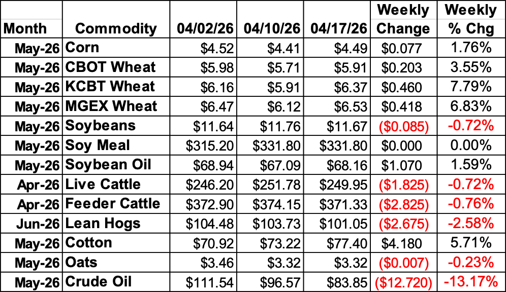 So far in 2026 we have had the commodities move at a little more of a volatile rate. While it is nothing we haven’t seen before, corn have moved 50 cents, with beans over a dollar and wheat nearly $1.50. Cotton has rallied nearly 15 cents, and not to mention cattle hitting fresh all time highs. The crude oil factor has been the rising tide, but we are just getting into the growing season for the row crops. We’ve already seen what a dry HRW country has done for wheat, with the recent rain in the corn belt putting an early halt to some planting. While it is still early to any major delays, the market is keeping a close eye on things. And then there is the always volatile growing season that has yet to be determined. While we have seen some movement in the commodities so far this year, and it is already the middle of April, it’s just the beginning.