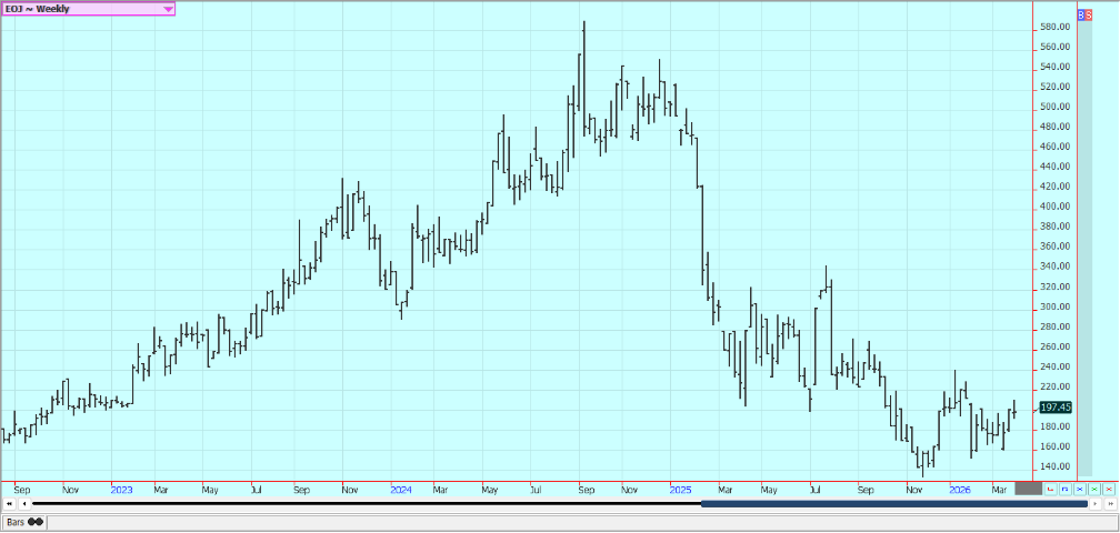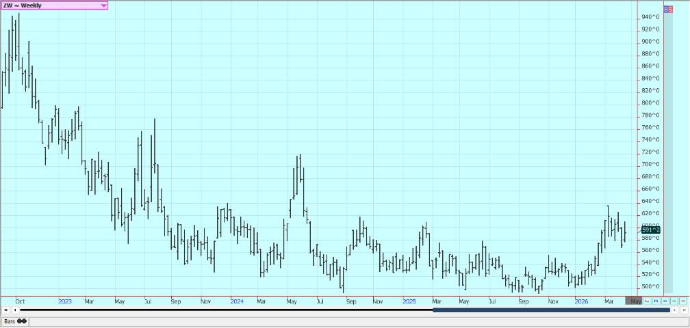 Frozen Concentrated Orange Juice and Citrus: Futures were lower last week on what was reported to be speculative selling. The Florida harvest is about over and isolated showers are now being reported. The weather for the next crop is dry but seasonal and some rains are starting to appear. Chart trends are down on the daily charts. The weather is considered good for production in Brazil and Mexico. Scattered showers are still reported in Brazil.