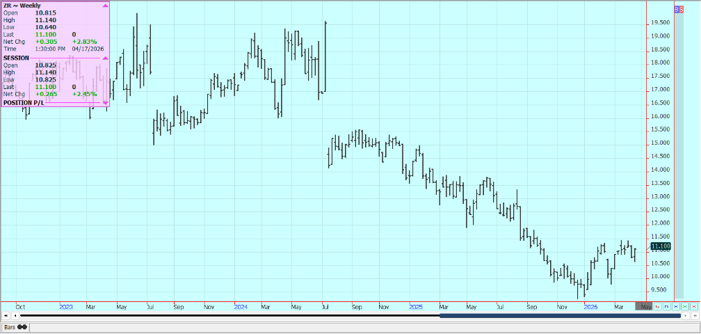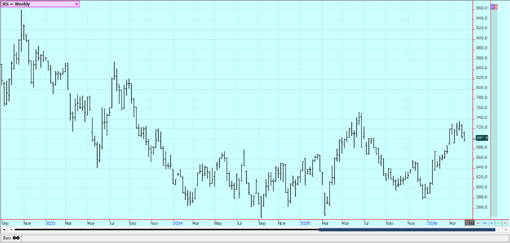 Rice: Rice closed higher last week helped in no small part to the big rally seen on Friday and trends are mixed. The market failed at resistance on the daily charts a couple of days ago. Traders anticipate less production this year in the US and around the world due to low prices. USDA said that Rice planted area would be about 12% less in the coming year. Demand remains moderate for US Rice but export demand has been less lately.